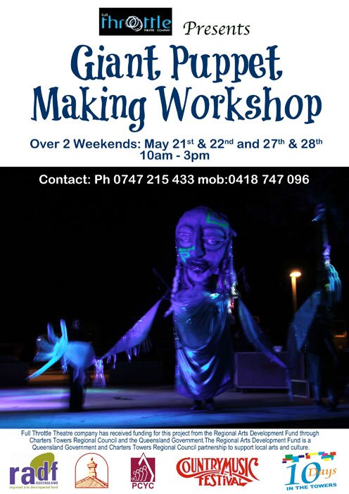 This project will entail a regional development tour to Charters Towers for the purpose of conducting a giant puppet making workshop at the PCYC. We thank the government for its support.